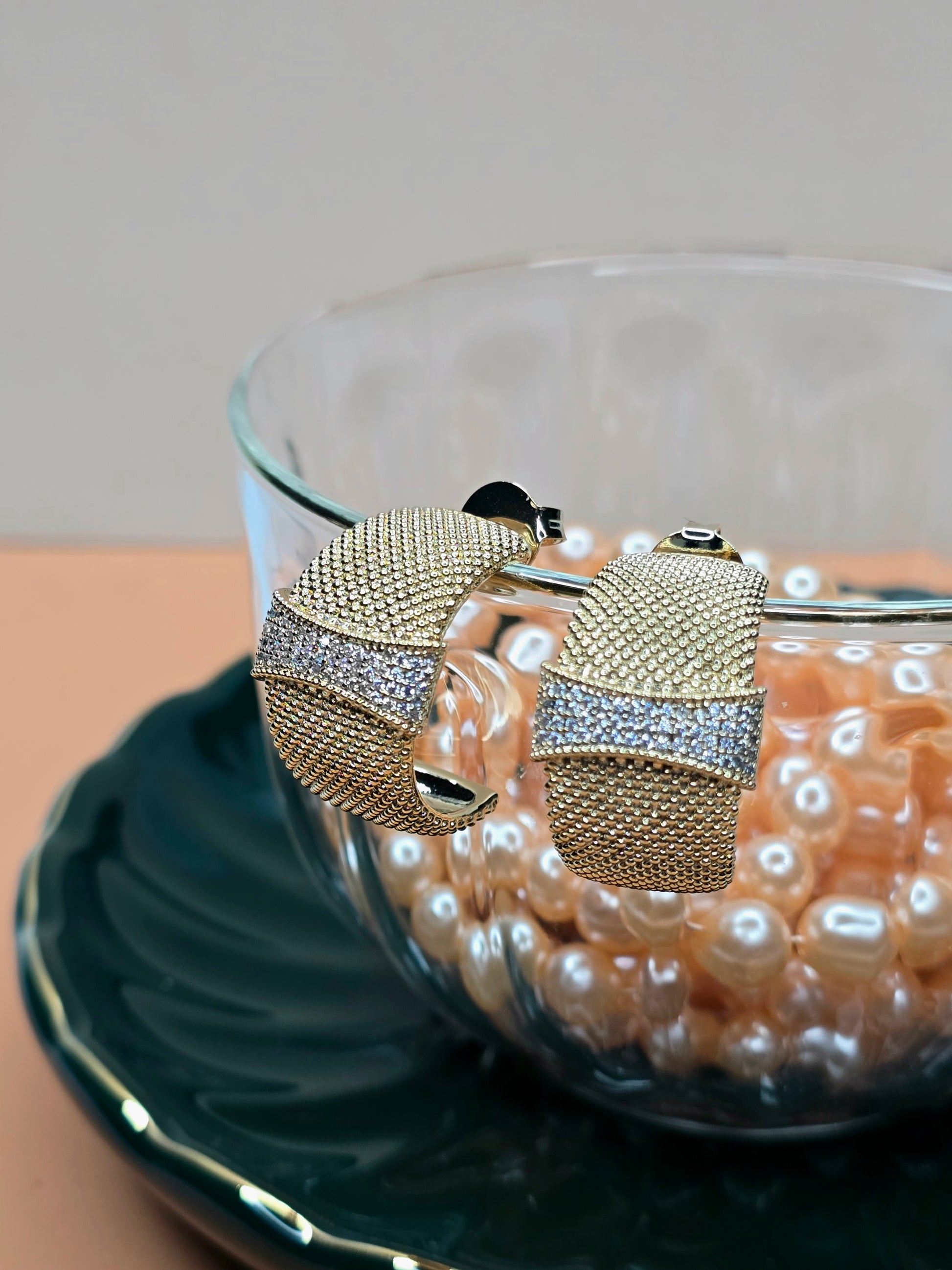 Conviértete en el centro de atención con nuestros aros de circonitas Golden Radiance. Estos exquisitos aros están bañados en oro a la perfección y presentan un diseño de aro único que le da un toque moderno a un estilo clásico. Adornados con circonitas brillantes, captan la luz de manera hermosa y crean un efecto deslumbrante que realza cualquier atuendo.