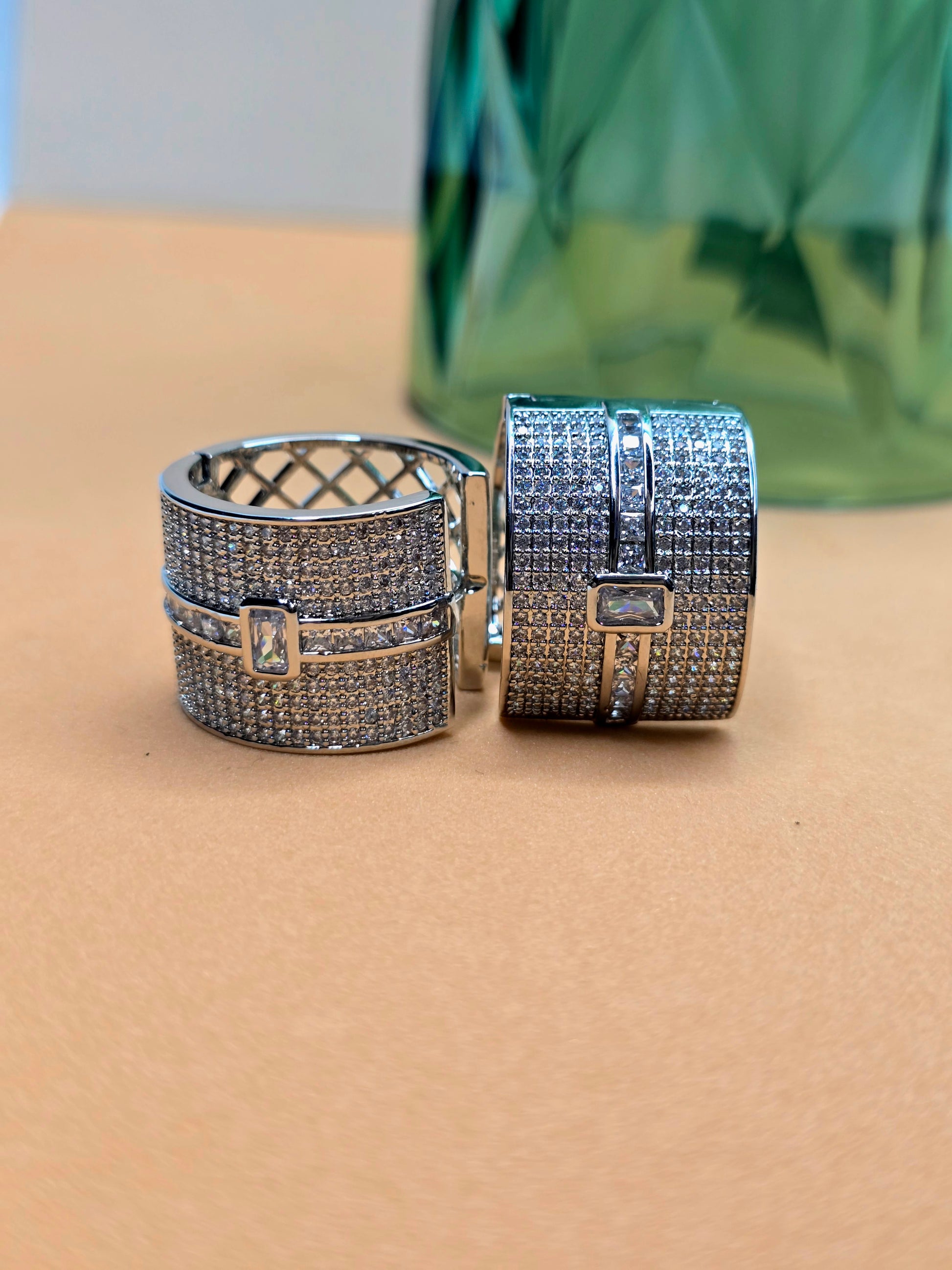 A diferencia de los aros comunes, estos iluminan tu estilo y te hacen difícil pasar desapercibido. Estos aros bañados en rodio radiante cuentan con una banda ancha incrustada con piedras brillantes que brillan con cada movimiento. El exclusivo detalle cuadrado agrega un toque de elegancia moderna, lo que hace que estos aretes sean una combinación perfecta de diseño clásico y contemporáneo. Ideales para cualquier ocasión, prometen realzar tu look con su deslumbrante encanto.