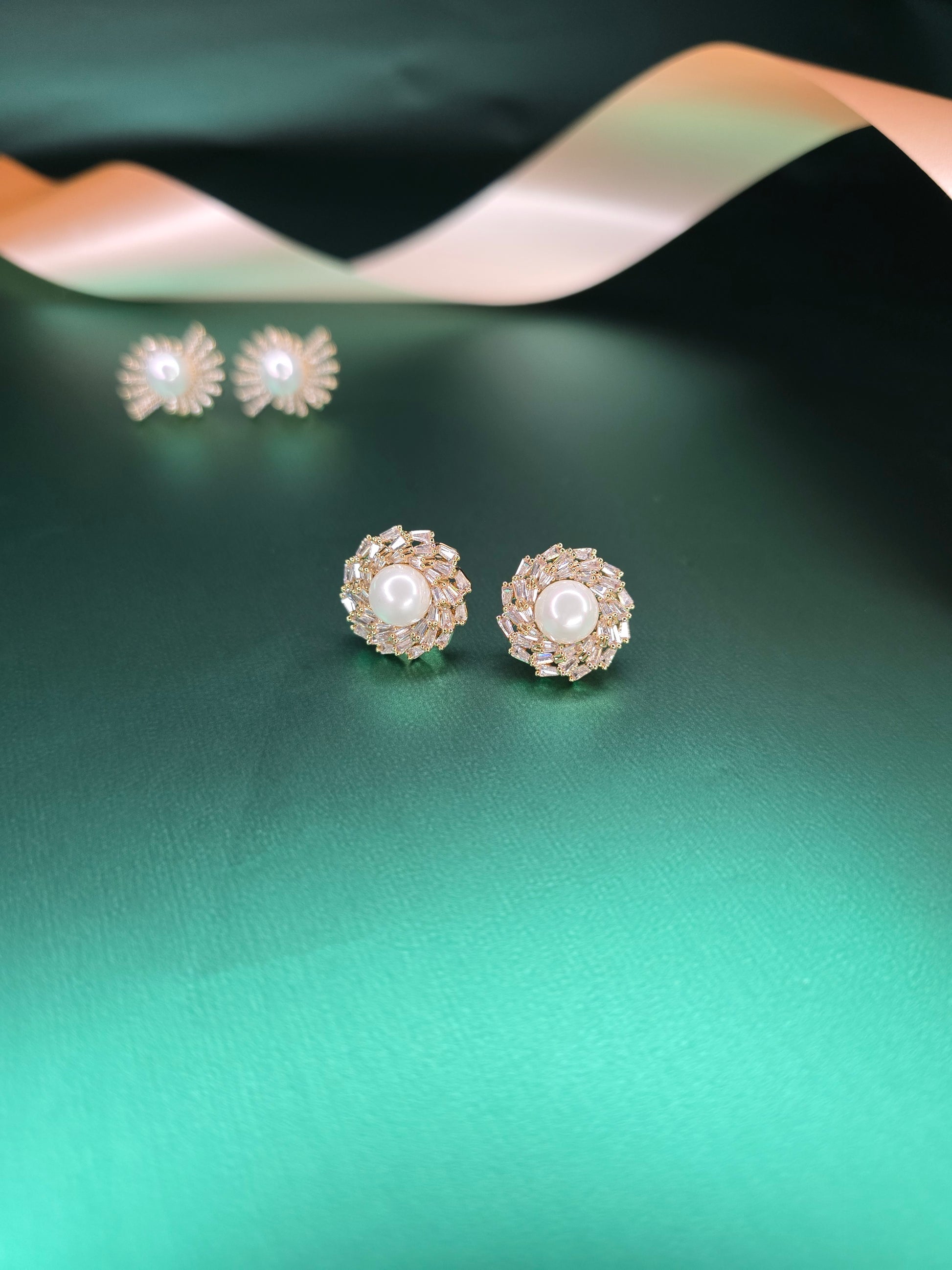 Los pendientes de la imagen están diseñados con una perla central que desprende un brillo suave y cremoso. Alrededor de la perla hay varias piedras preciosas pequeñas y transparentes dispuestas en un patrón similar a una flor y un baño de oro que le aporta un toque de brillo y elegancia. El diseño general es sofisticado y lujoso, lo que hace que estos pendientes sean un accesorio perfecto tanto para ocasiones formales como informales.