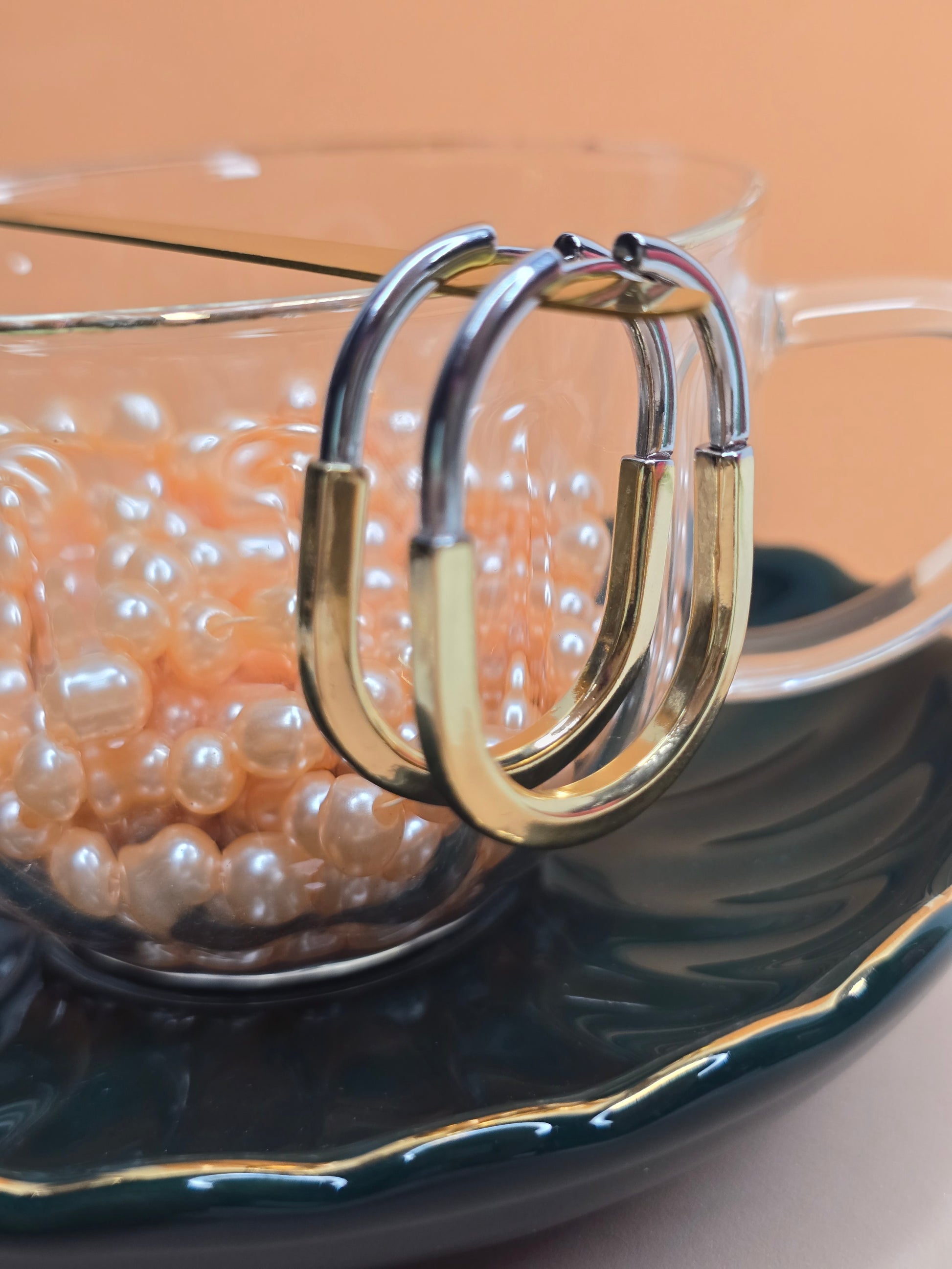 Elevate your style with our Dual-Tone Elegance Oval Hoops. These stunning earrings feature a sophisticated design with a unique blend of half gold and half silver tones, creating a striking contrast that catches the eye. Perfect for any occasion, these hoops add a touch of modern elegance to your look. Whether you’re dressing up for a night out or adding a chic touch to your everyday attire, these earrings are a versatile and stylish choice.