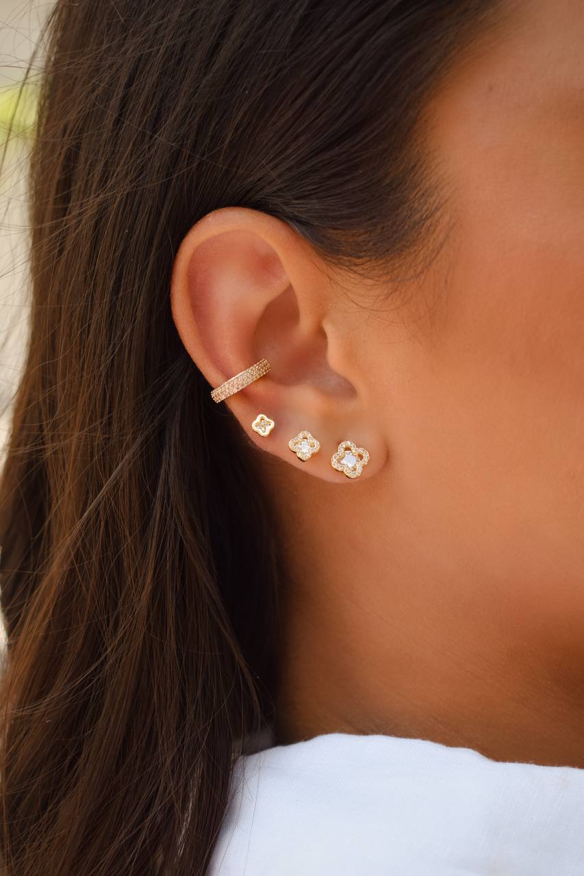 Añade un toque de elegancia y brillo a tu look con este hermoso set de aretes tipo Van Cleef. Este trío incluye tres tamaños diferentes, desde pequeños hasta más grandes, perfectos para combinar o usar individualmente según la ocasión. El set es Chapado en oro de 18k