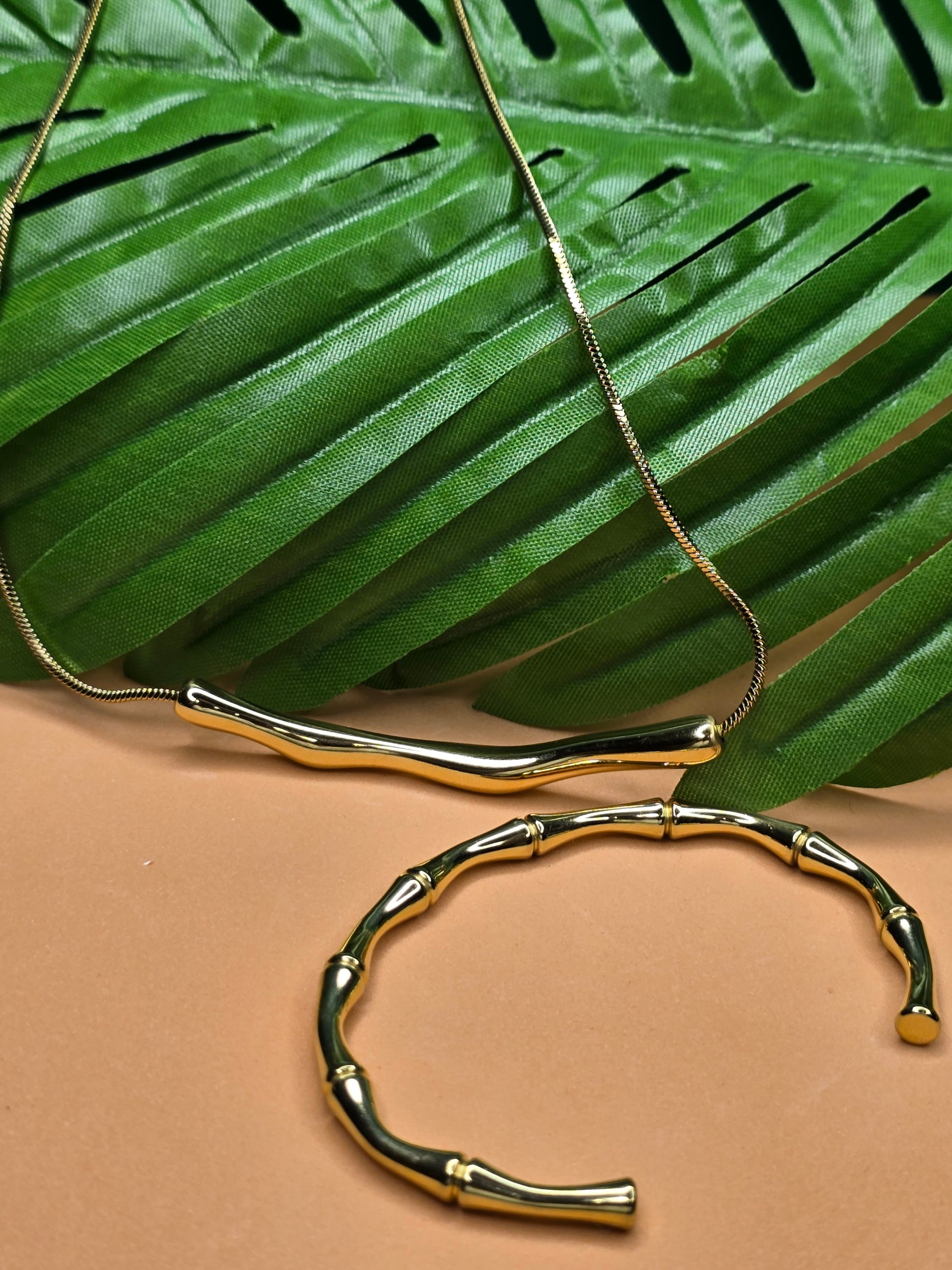 Este conjunto de collar y pulsera inspirados en el bambú está elaborado con acero inoxidable duradero en tono dorado, que combina la elegancia natural con la sofisticación moderna. El diseño presenta un metal elegante y texturizado que imita la forma orgánica de los tallos de bambú, creando una estética minimalista pero llamativa. El material liviano e hipoalergénico garantiza comodidad para usar durante todo el día, mientras que el acabado dorado pulido agrega un toque de lujo. Este conjunto es lo suficientemente versátil como para complementar conjuntos casuales o realzar la vestimenta formal, lo que lo convierte en una adición atemporal a cualquier colección de joyas.