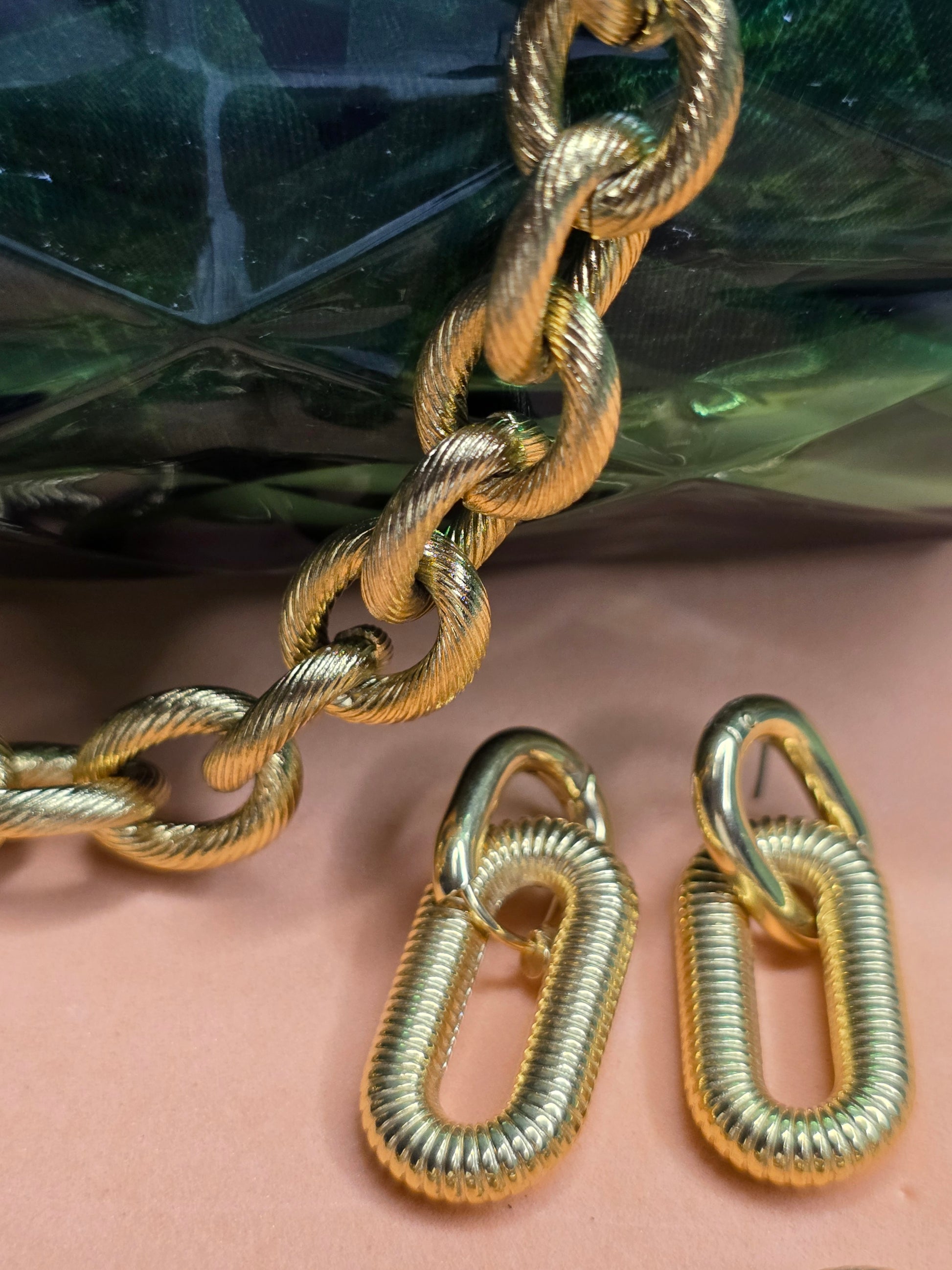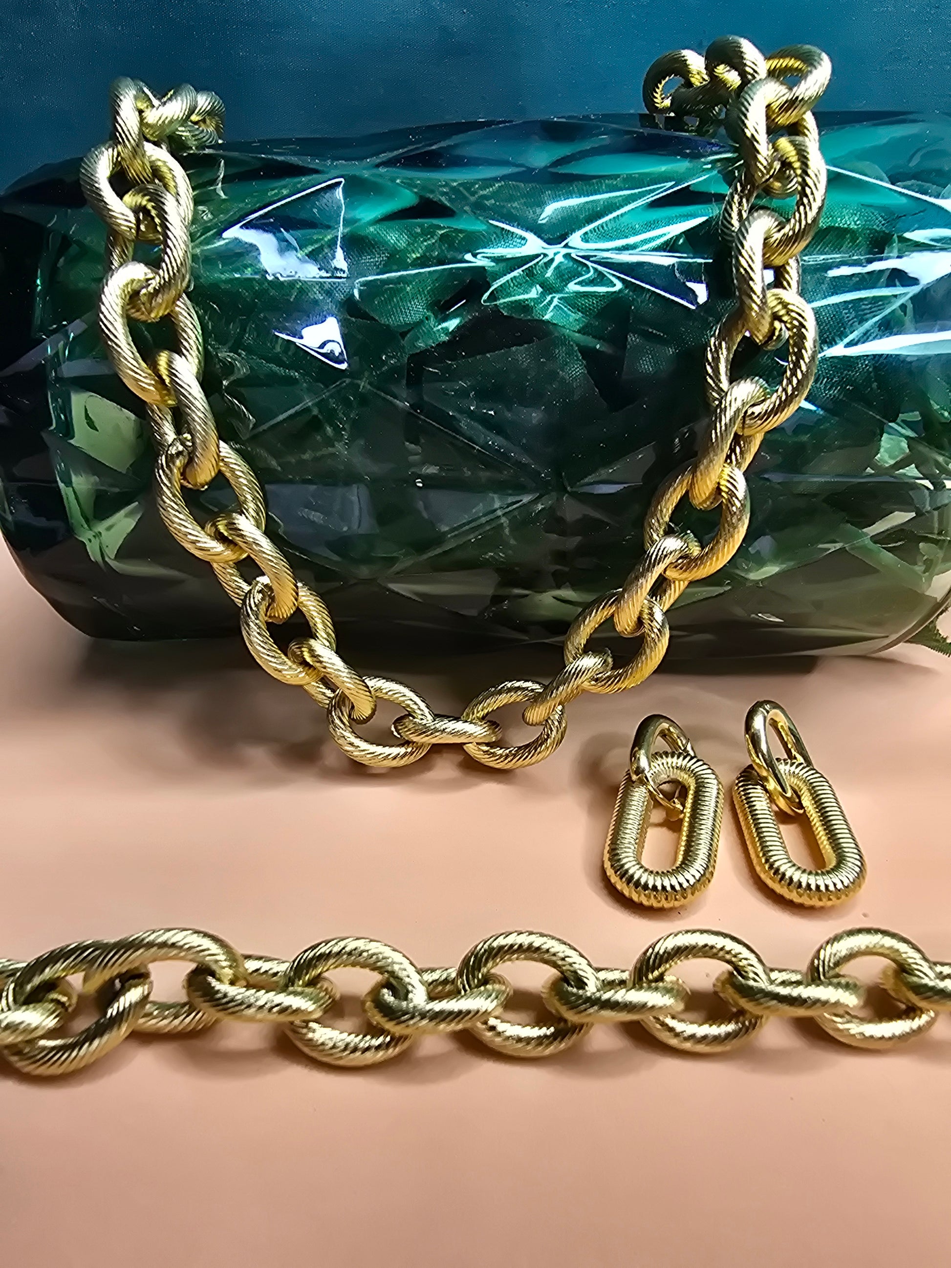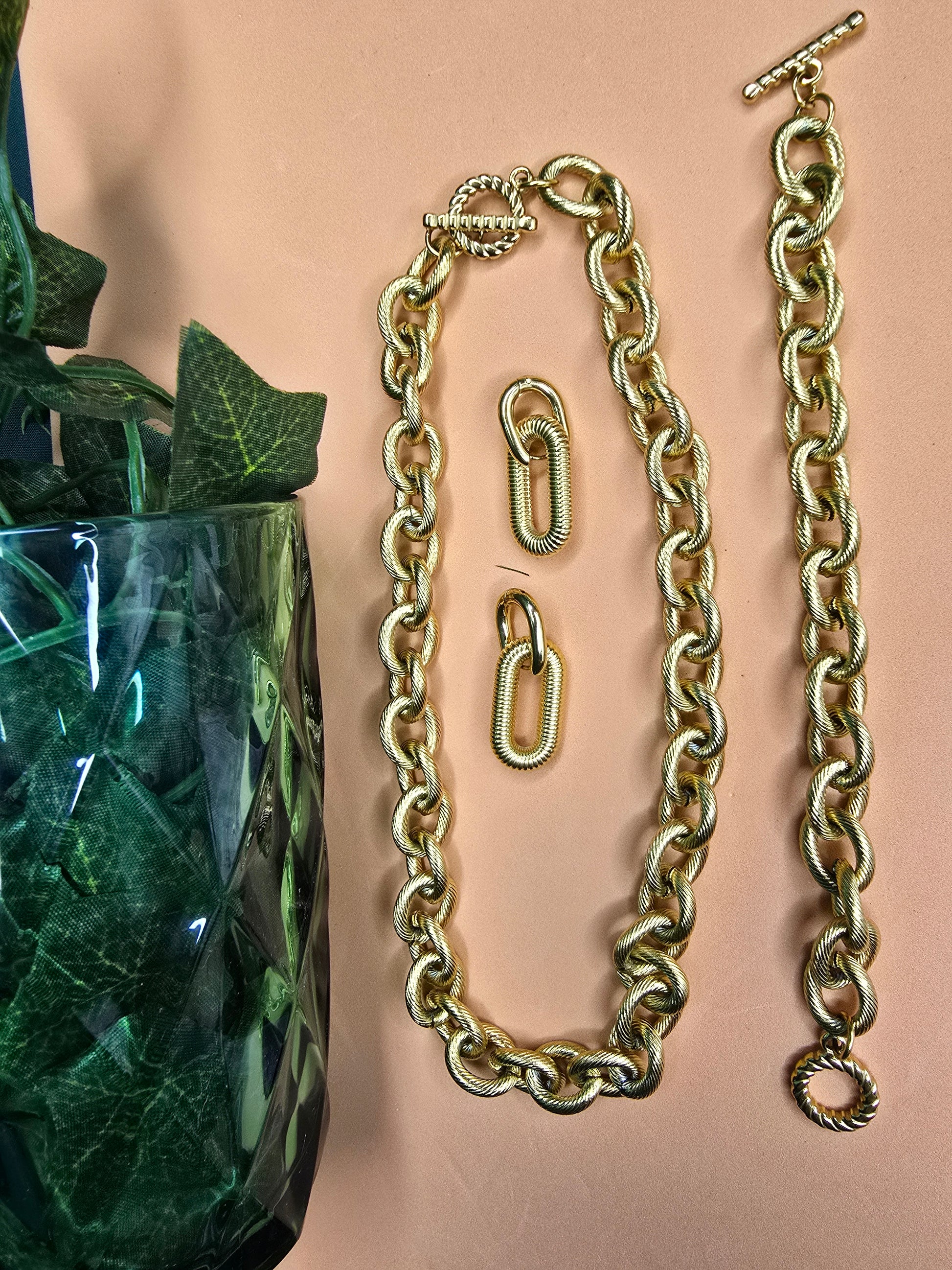 Elevate your style with this luxurious and durable set: Necklace, Bracelet and earring in a bold, chunky chain with textured links style, crafted from high-quality stainless steel for long-lasting shine and resistance to tarnishing.
